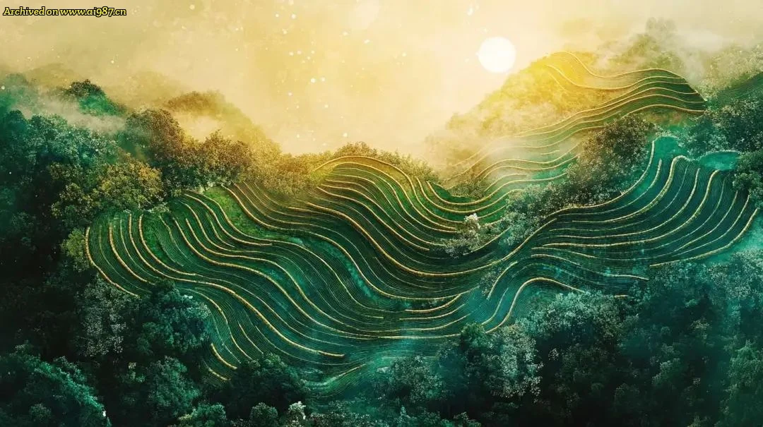 航拍视角的云雾茶园,晨光穿过茶树枝叶