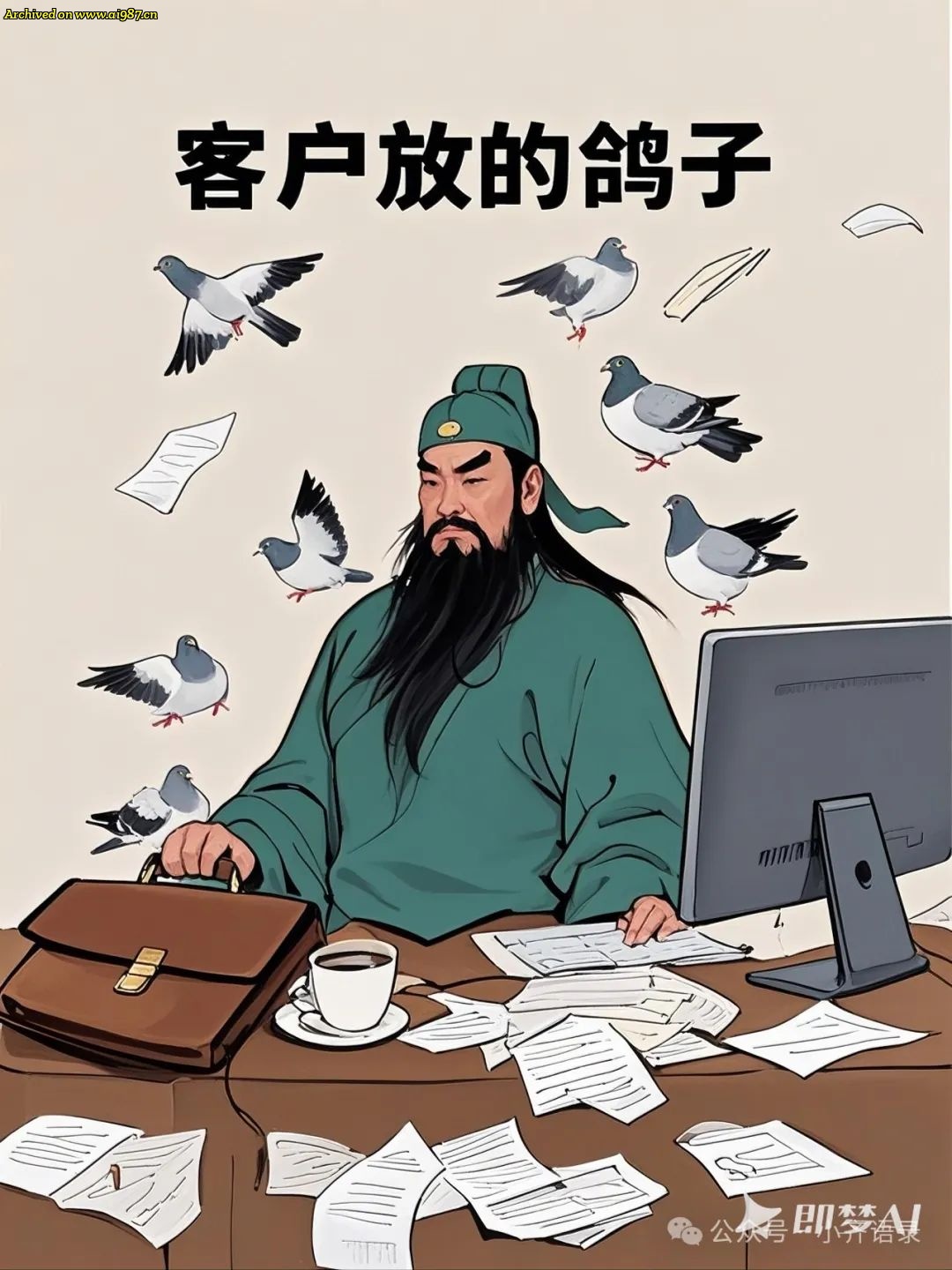 屋里飞着十几只飞走的鸽子,目光若有所思,配文字“客户放的鸽子”